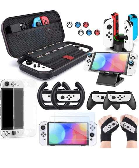 LOT 1149 - Like new Switch OLED Accessories Bundle, innoAura 20 in 1 Switch OLED Accessories Kit Include Wrist Straps, Switch Carry Case, J-con Charging Dock, J-con Grips & Racing Wheels. Missing one racing wheel and one controller, and gloves. Opened box.damaged box