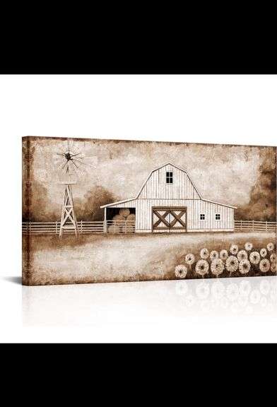 LOT 280 - New Visual Art Decor Farmhouse Wall Art Rustic Barn Windmill Farmhouse Landscape Painting Country Decor, Framed Artwork for Home Walls (Brown)